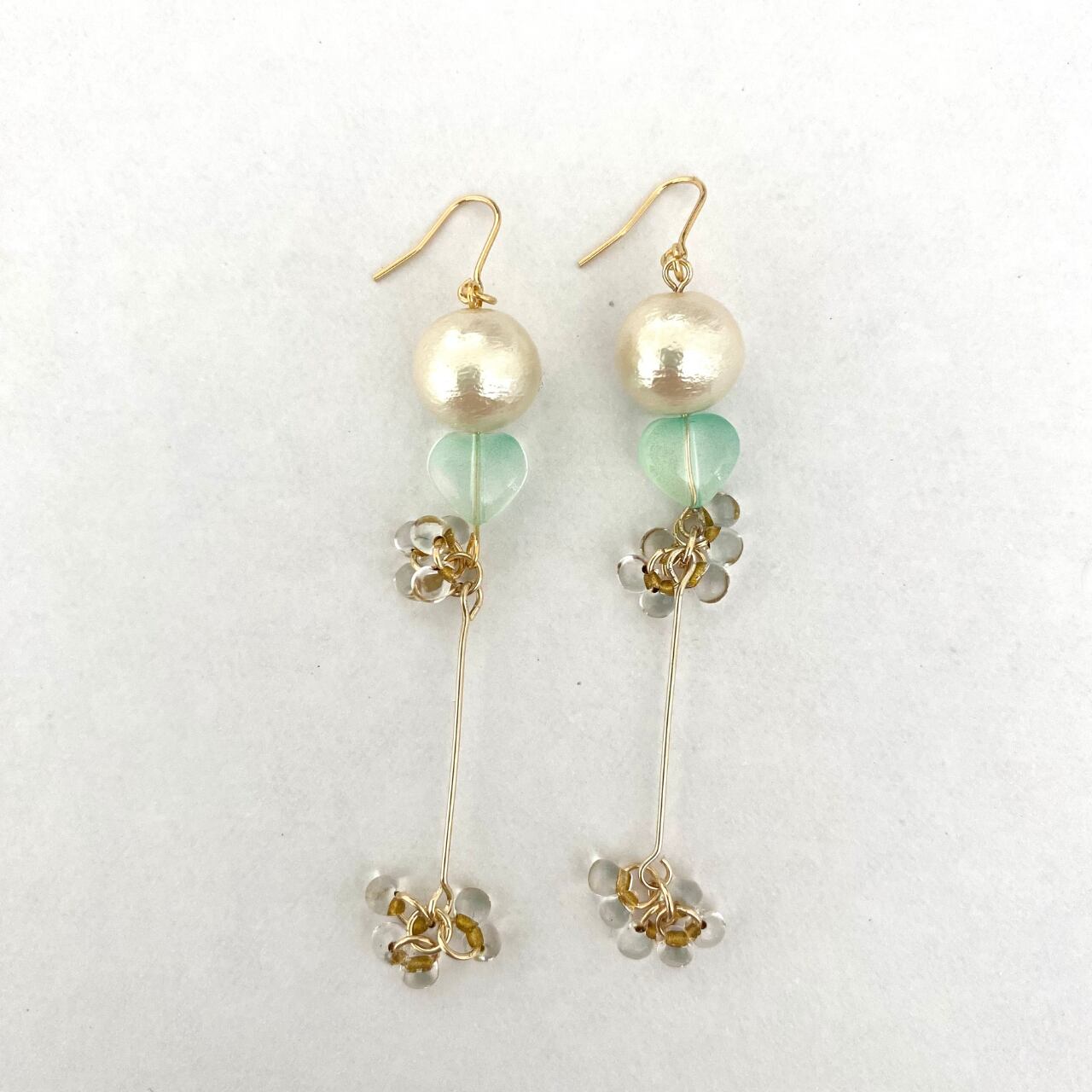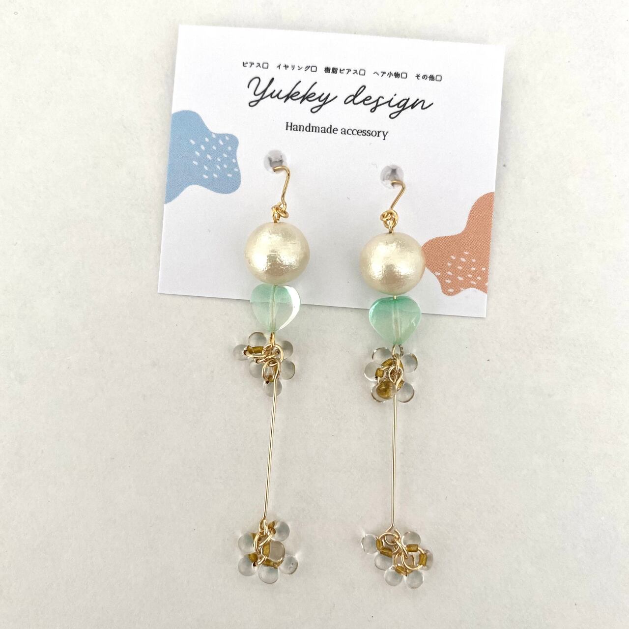 淡いグリーンのハートビーズとコットンパールがポイント!